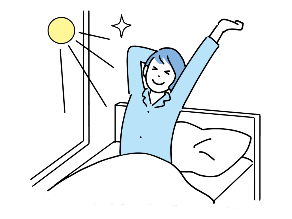 起床後30分~60分までの間に朝日を浴びることで脳が覚醒し、セロトニンというホルモンが分泌されます。セロトニンは「幸せホルモン」として注目されており、ストレス軽減・リラックス効果・集中力向上など嬉しい作用がたくさん!